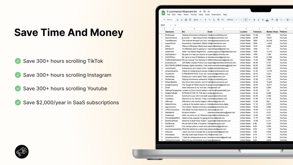 Save 300+ hours of painful research with our database of 1,800+ E-commerce Creators from Youtube, Instagram & TikTok.